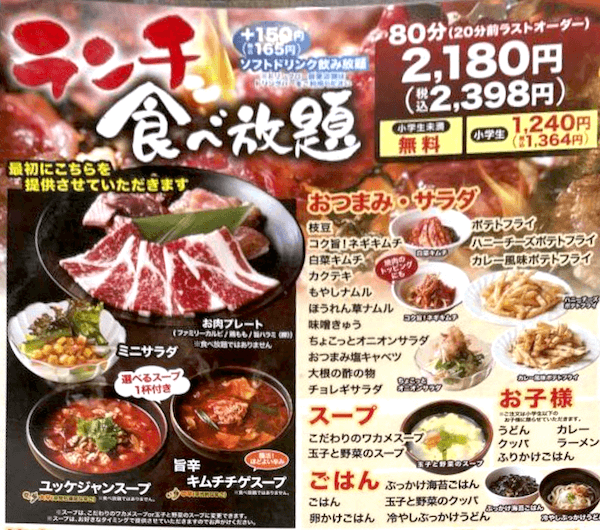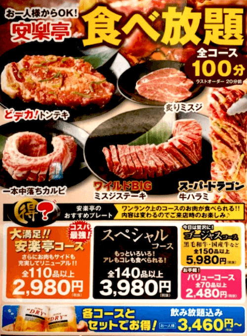 まずは、私がいつも利用している「安楽亭」の食べ放題メニューと価格をご覧ください。