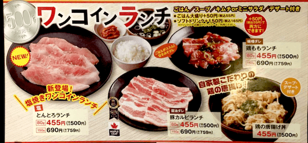 安楽亭のランチメニューで一番安いのが「豚カルビランチ80g」と「とんとろランチ(80g)」で、値段は455円(税込み500円)です。